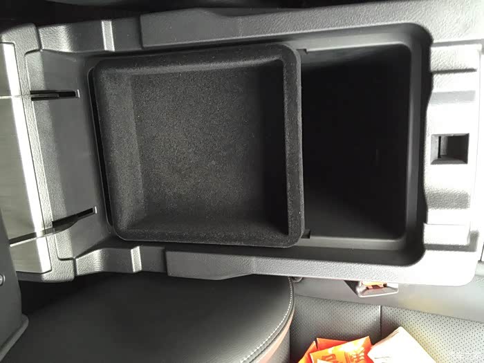 扶手箱两层,上面的格子能调前后,下面的空间很大,放4、5瓶矿泉水问题不大。