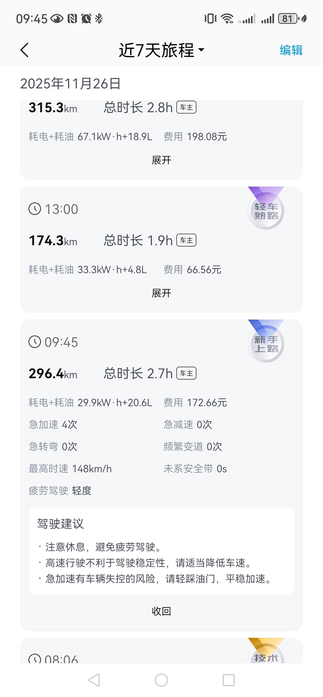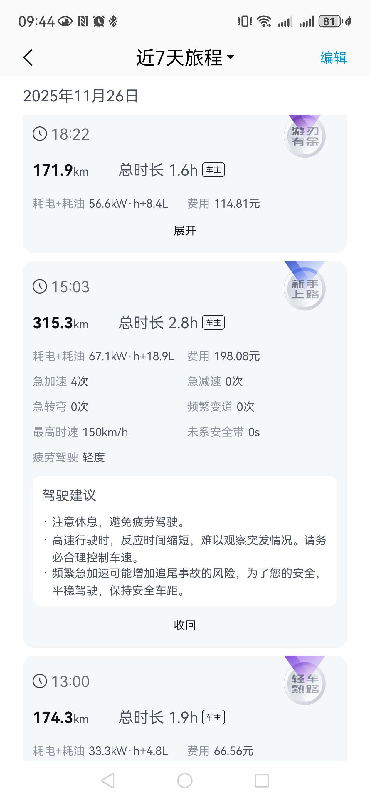 整体感受:从浙江湖州出发,单程1050Km,往返超过2100公里,总体来说挺满意。设置舒适模式,云辇悬浮模式,强制保电35%,没有开到亮黄灯才进服务区加油和充电,基本都是感觉累了就进服务区休息顺便加油,全程压着限速+10%跑基本,遇到车就超车,区间测速平均车速没有低于110的,平均车速基本都是120左右,满油满电预估800以上。虽然我就没在意过能耗,但是有个高速服务最贵1.998的电价确实有点儿夸张