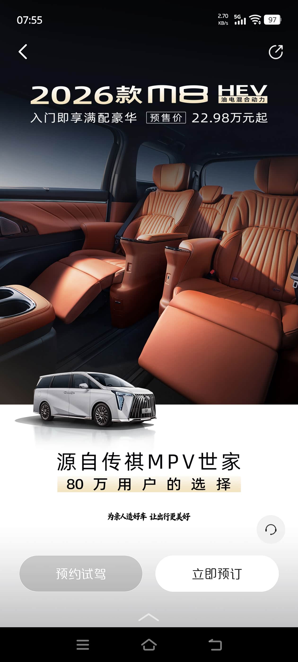 为何没有选四驱?腾势D9、梦想家、高山8等好几款竞品都是四驱,但搭乘MPV的基本上都是家人或重要客人,个人认为追求零百加速在6秒以内的不是MPV的本职,MPV讲究的是行驶平稳舒适、刹车不点头、行驶不摇晃,这些才是它应该具有的水准,况且传祺向往M8乾崑零百加速也达到8秒,不算慢了,个人觉得够用,因此是否四驱对我来说不成为选择的否定项。