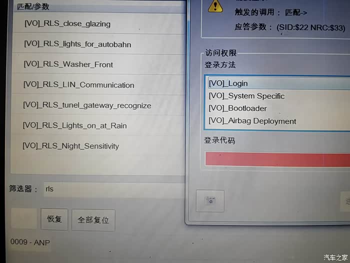 该车型目前09中央电气系统的安全访问密码谁都不知道(包括4s),导致下雨自动升窗/光线传感器调灵敏度等无法通过匹配完成。