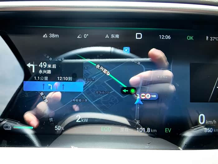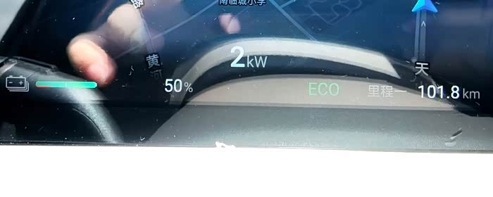 电量剩余百分之五十的时候,表显跑到101.8公里,加上之前没开里程小计之前跑了大约有五公里,加起来有107公里。这样算下来,满电能跑214公里。我的车是1040那一款,官方纯电续航是190公里,这样算下来竟然还要比官方的续航还要多二十四公里。