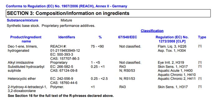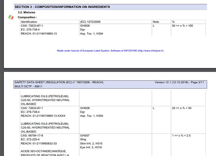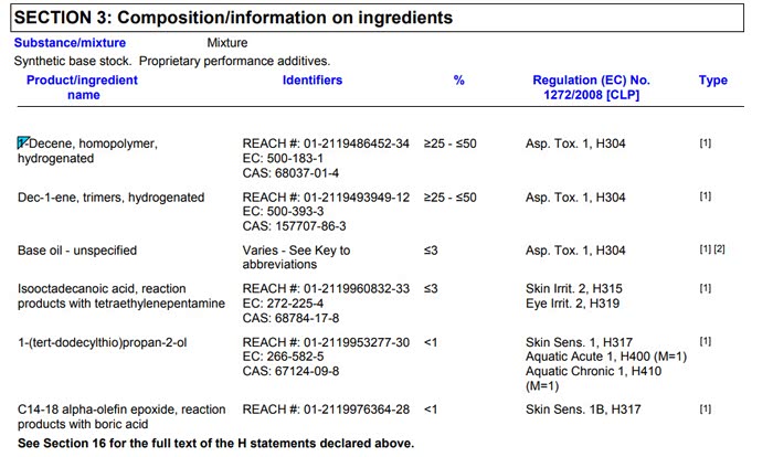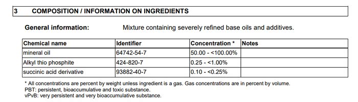 从上面的几款变速箱油(其中嘉实多Transmax Dual算新款原厂)的基础数据对比,可以发现两款平替非原厂油相比于两款原厂油(旧款三菱SSTF-1,新款嘉实多Transmax Dual),在运动粘度上有一定区别,但是在倾点和闪点却有着巨大区别。因此我决定查看这四种油的SDS。