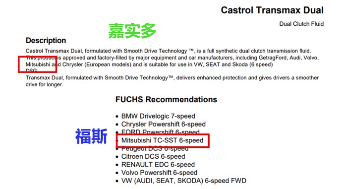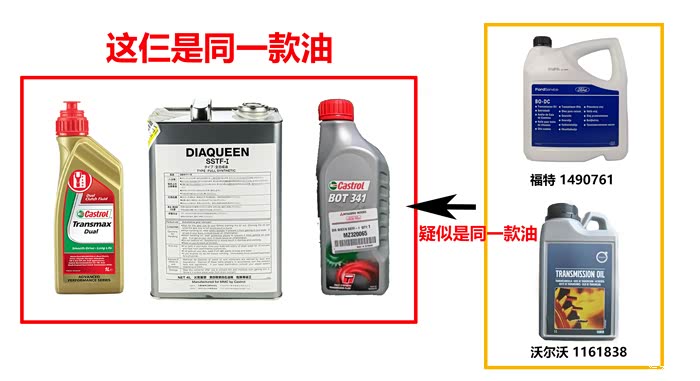 根据欧美EVO10论坛车主“amir008”的研究, 嘉实多 BOT 341 和 嘉实多 Transmax Dual和这个三菱原厂的SSTF-1是同一款油 [4]。 另外这款油还被以OEM贴牌罐装分销的方式提供给了福特,沃尔沃,大众,克莱斯勒等主机厂使用。这款油在不同的包装里,价格也有了巨大的差别。拿嘉实多Transmax Dual举例,能比三菱原厂SSTF-1便宜一半(如果购置大桶装能便宜更多)。但是很可惜,这些油在国内的零售渠道都比较难以购买或者难以以好价入手。