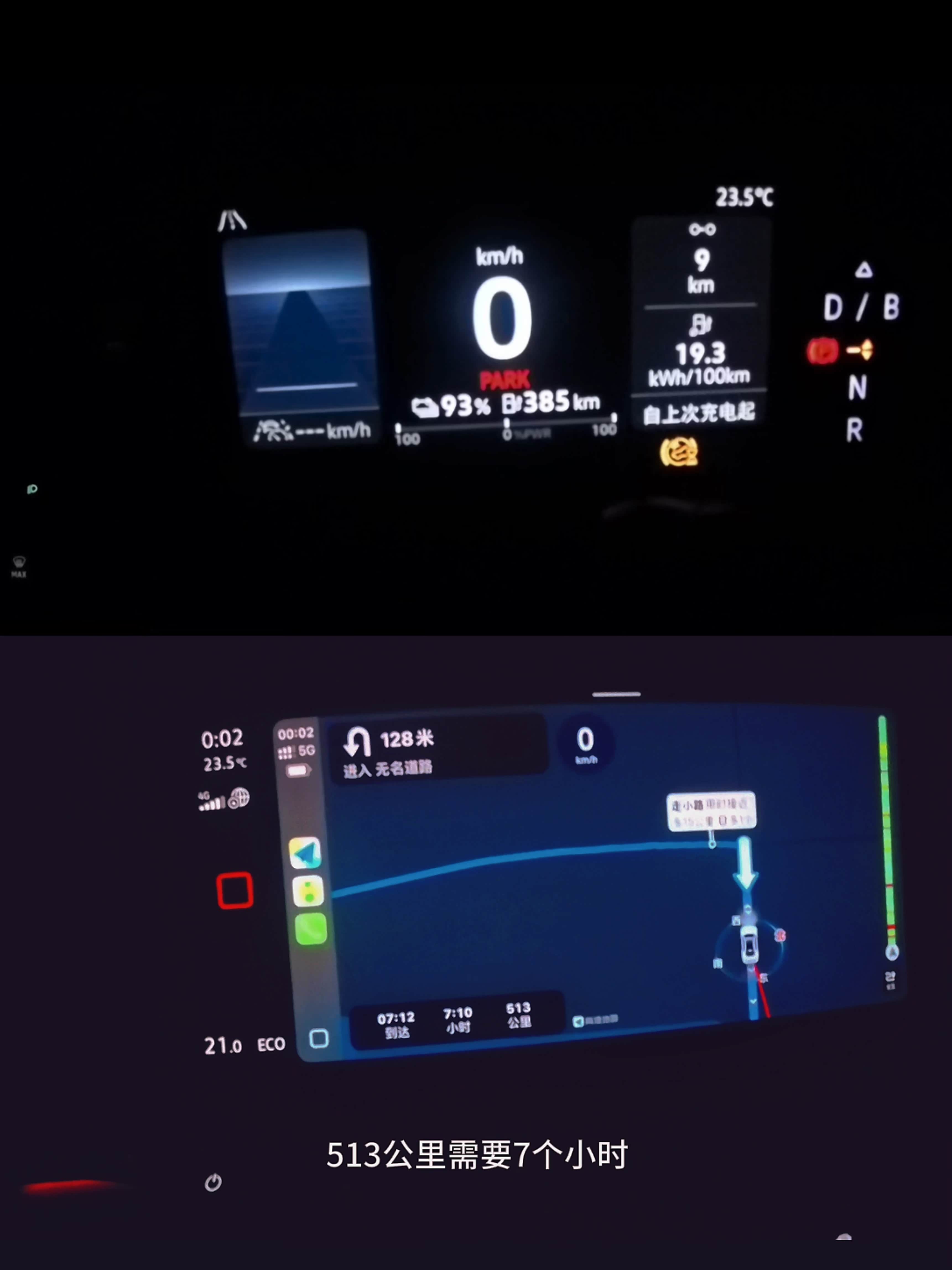 有了回家的经验,返程我们学聪明了,决定错峰出行。于是,我们在7日0点(半夜)准时出发。出发时电量93%,表显续航385公里。导航显示513公里,预估用时7小时,心里先小小开心了一下。