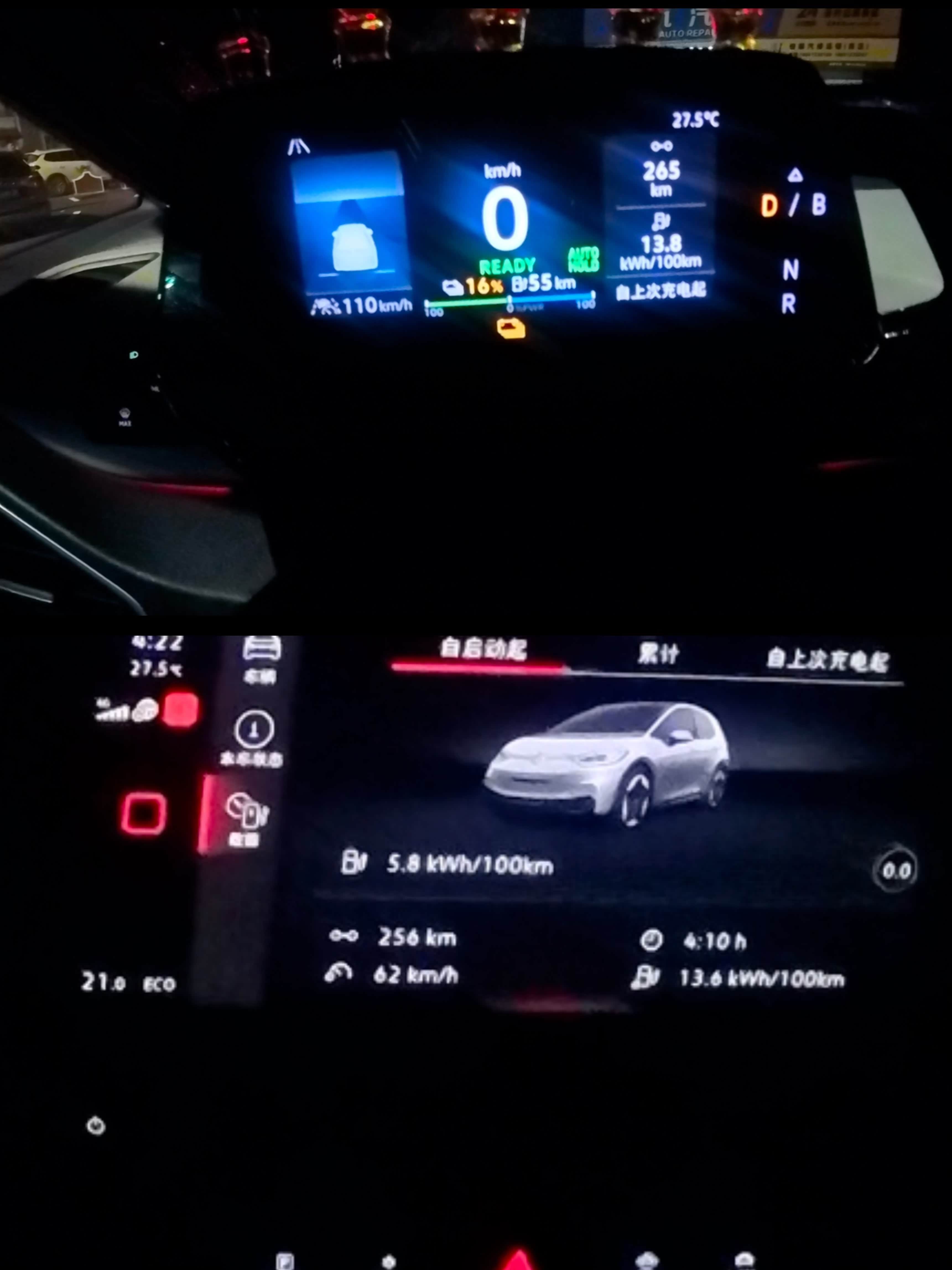 此时是凌晨4:30,累计行驶了265公里,剩余电量16%,续航55公里。这段路平均时速65km/h,平均电耗13.6。然而,凌晨的服务区充电站就需要排队了!我们大概排了30分钟,加上充电1小时,总共耗时1.5小时,在早上6点整继续出发。