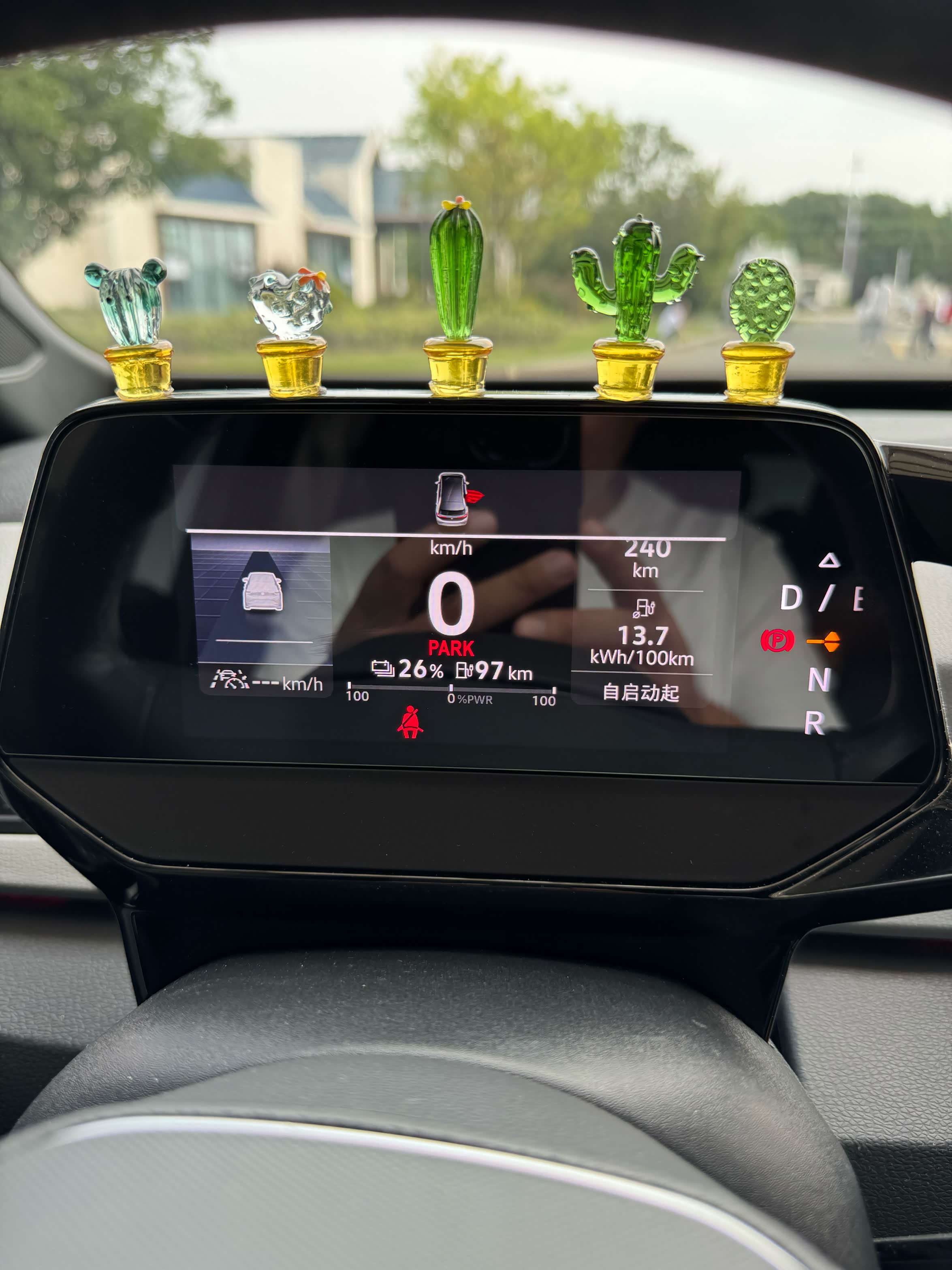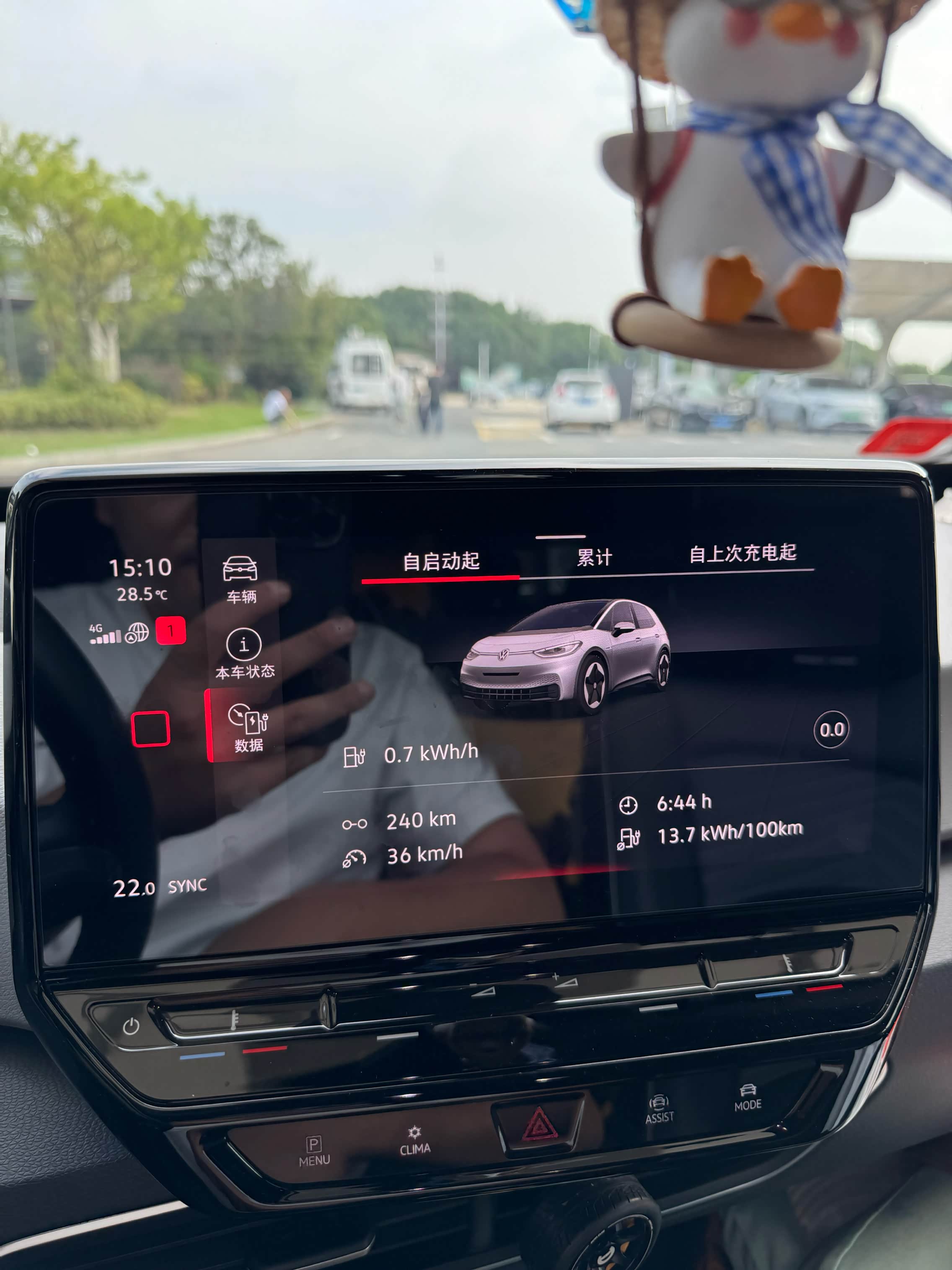 到了下午3:00,开了6小时44分钟,累计行驶了240公里。此时仪表盘显示电量还剩26%,剩余续航97公里。平均电耗13.7kWh/100km,平均时速只有36km/h。人乏了,车也饿了,果断开进服务区,准备吃饭、充电、休息三不误。