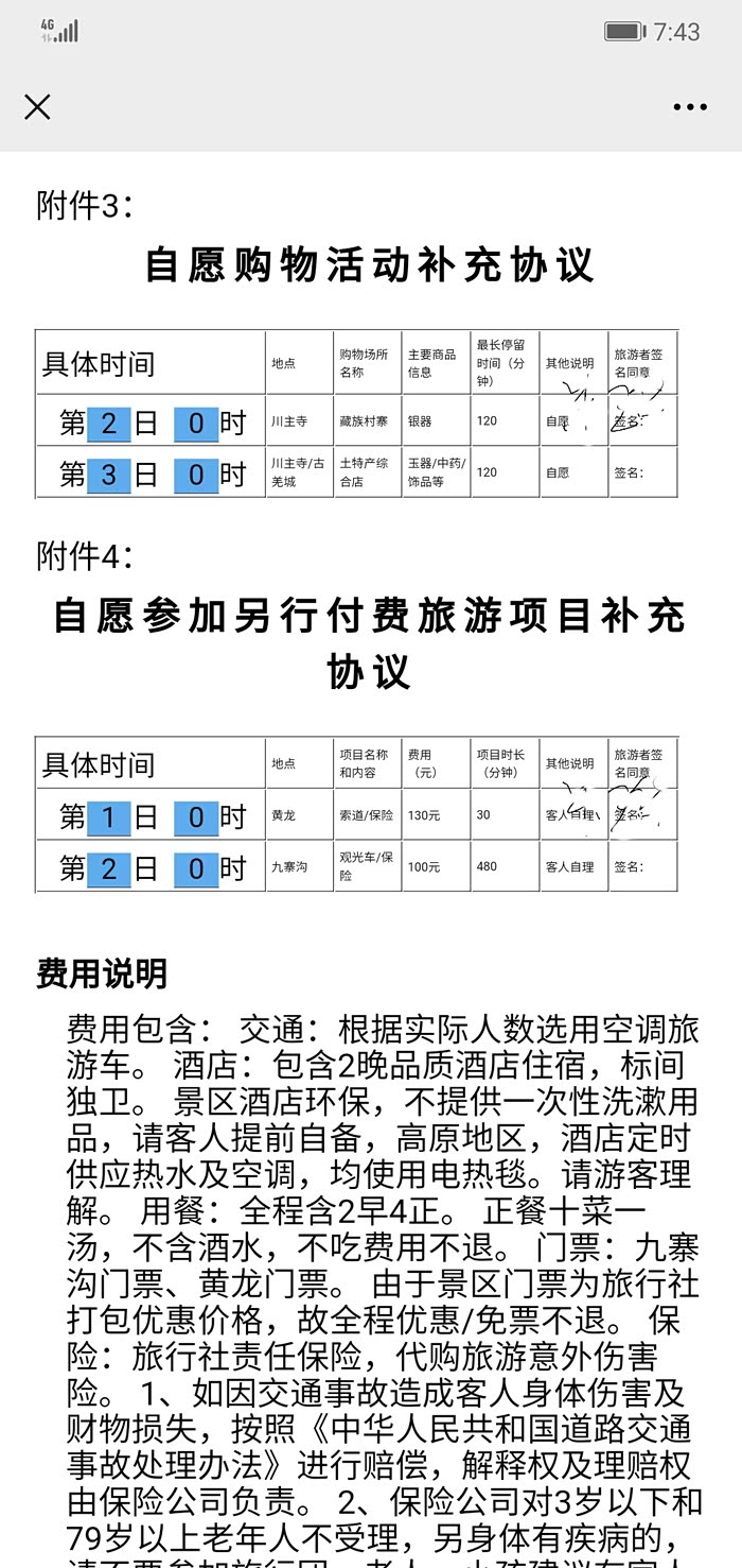 我们报名的是成都地接黄龙九寨沟乐山大佛精品游,要求整个行程不含购物,但我们到成都后旅行社还是硬塞给我们含购物的旅游合同。