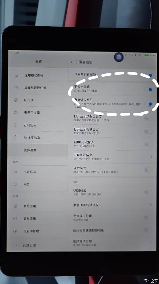 [1]首先,设置平板。为什么必须用安卓平板,因为只有安卓平板才能设置成完美适配车载的模式。这里我用的是小米平板,想装的推荐大家咸鱼淘一个,小米平板二代几百块就能买到。 【打开平板】【进入设置】【点击关于平板】【点击MIUI版本,连续点6次,就会提示已经打开开发者模式】【点击更多设置 点开发者选项】【然后打开图中的这两项设置】【OK,平板设置完成,完美适配车载】