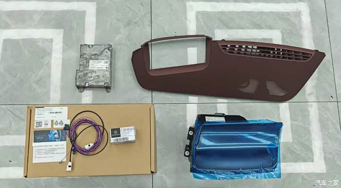 抬头显示肯定少不了的显示器,高配的雨量传感器,仪表模块,还有仪表台带显示器位置的饰板(需和车上的仪表台颜色匹配),主要就是这些组成了。