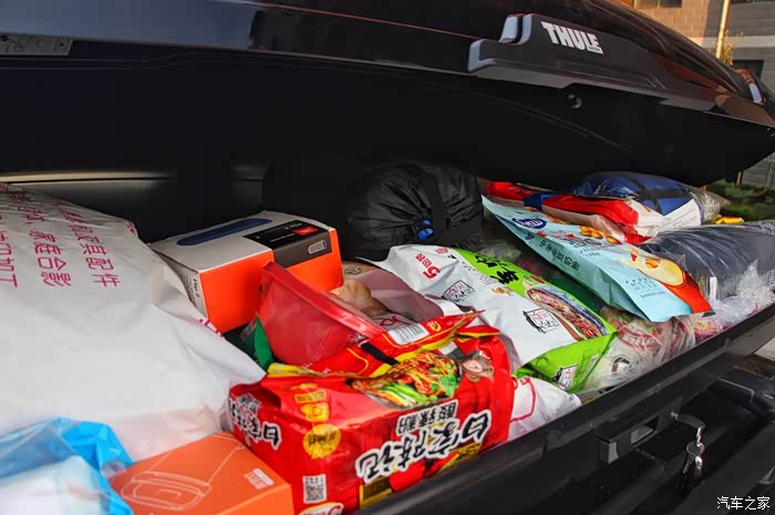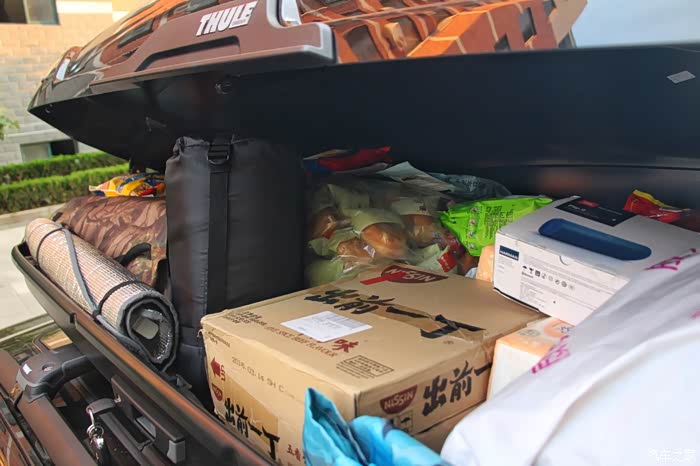上面那些物资基本都被我塞进了车顶行李箱里,还包括一床被子、3件羽绒服,满满当当500L啊!