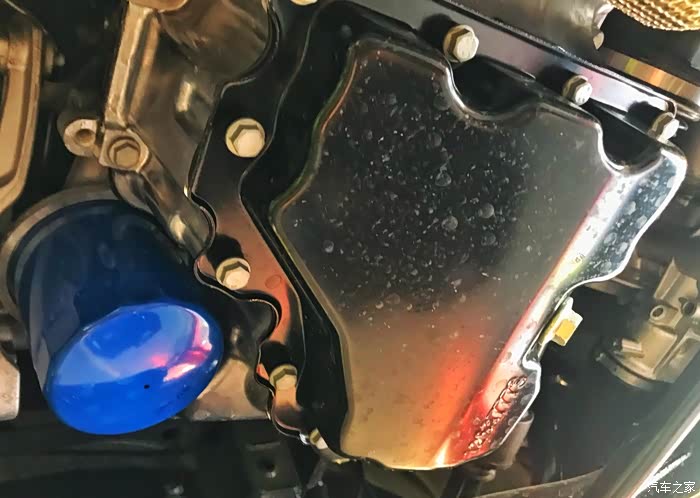 这个就是机油底壳,厚钢板材质,发动机护板保护的就是这个壳。 蓝色的是机油滤芯。