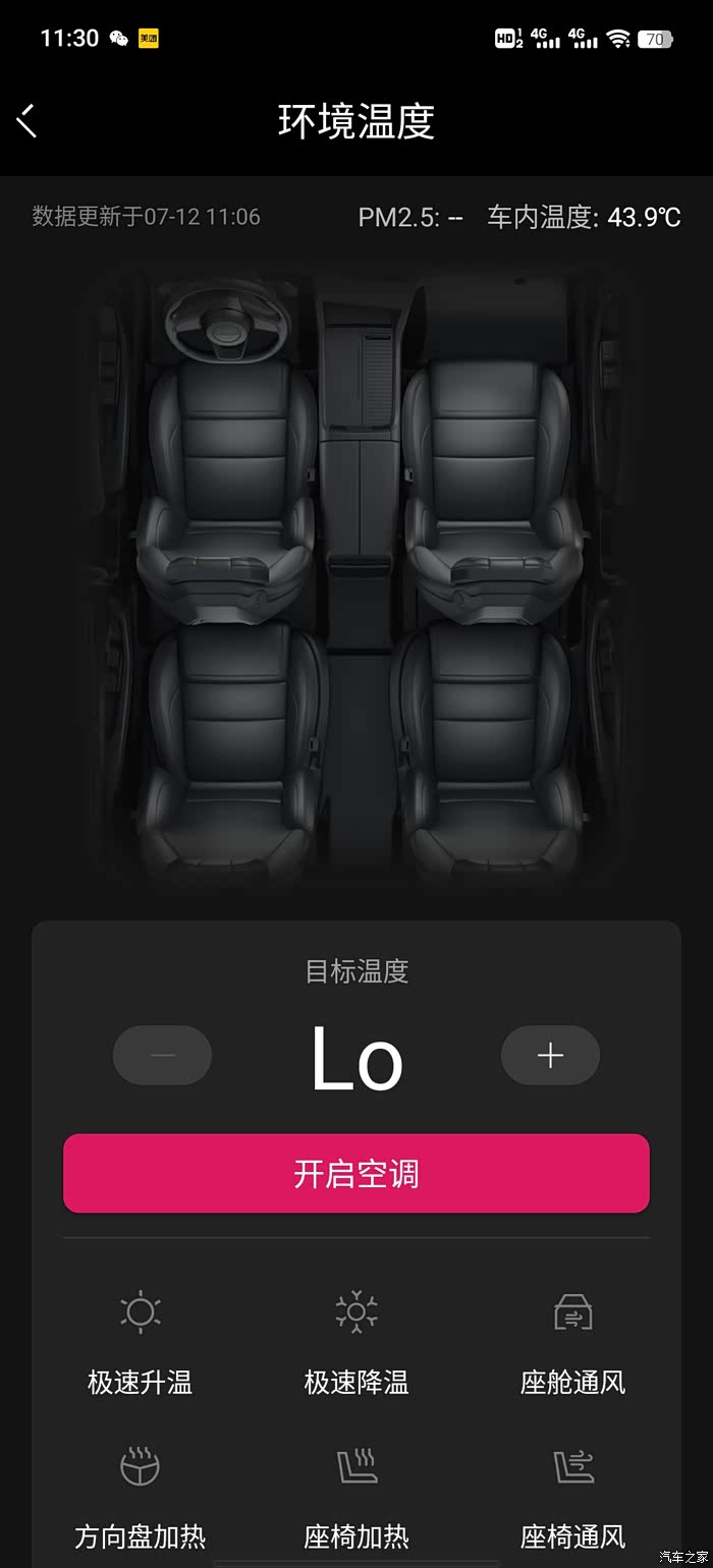 之前远程开启空调会打开引擎,现在在APP里,点击空调界面(如图小红点的位置),进入后开启空调,不启动引擎,使用纯电。