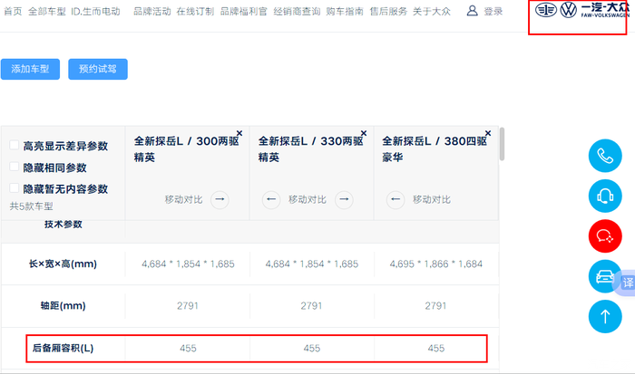 新款探岳L后备箱官方给出的数据确实是455L,其两侧轮窝凸起上方的构造和探岳有所区别,做成一个平面,不知道官方的数据是否根据这个来的还是厂家数据发生了失误。但是媒体都是用手工测量的数据也是靠谱的,因为基本的可用空间没变,探岳L还加长了9厘米,是不可能比探岳506L的后备箱还小的,518L也正符合加长9厘米的变化范围。