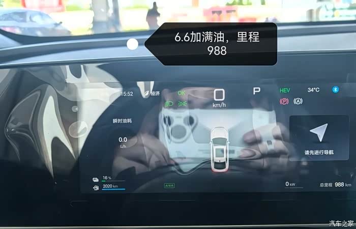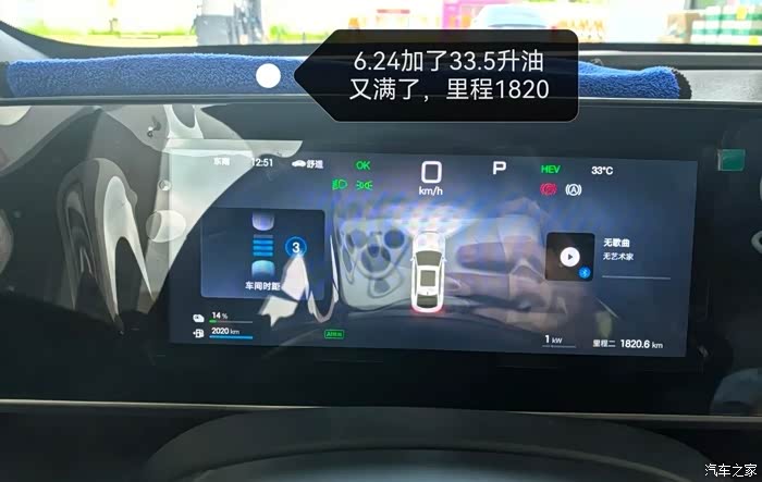 为了验证这车馈电油耗,我打算实测下,本人这个月6.6加满油表显续航2020公里,表显总里程988公里,今天6.24听说油价准备上涨又去加满,表现续航2020公里,总里程1820公里。之前充过一次满电,总里程要减去60公里。实际跑了1820-988-60=772公里,这次加油33.5L