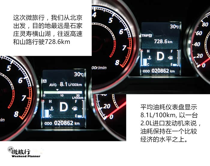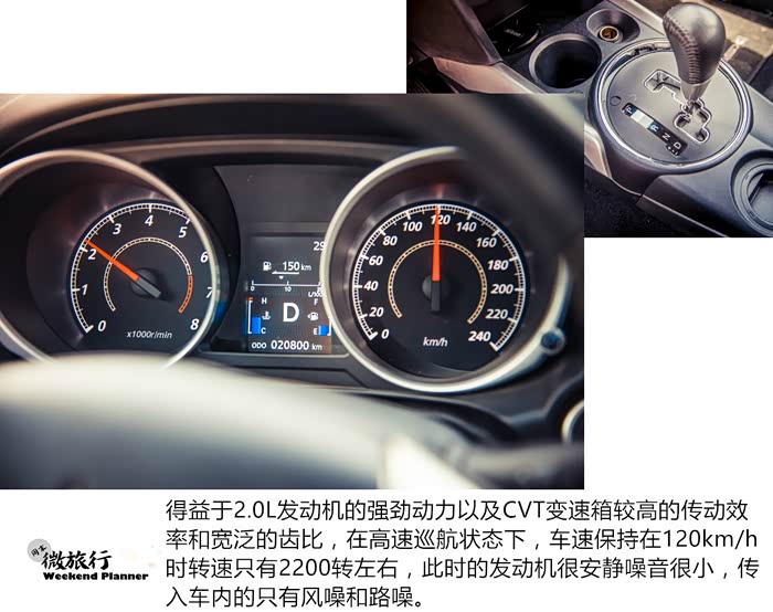 2.0L进口发动机不仅动力很强,油耗也可以保持在一个比较经济的水平之上,尤其是配合CVT变速箱,120高速巡航状态下只有2200转,非常的经济节能。PS:我们由于又是拍照片又是录视频,往往就要耽误很久,CUT镜头重拍也是常态,车辆就要反复的起步加速,而且还要长时间的怠速运转,再加上最后陷车脱困更是将油耗拉高到了一个非常高的高度,相信各位车友大神们的油耗肯定要比我这个女司机的更低。