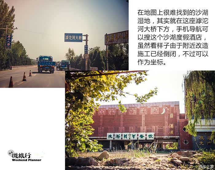 3.沙湖湿地位置和现状:自驾去的话,大家导航一个坐标,沙湖假日酒店(虽然已经倒闭,但是地图上仍然有哈),就在滹沱河大桥的北侧,桥口西边有一条土路下去就可以到。在滹沱河大桥上,可以看到湿地全貌,还是很美的,也有很多爱玩的车友在里面钓鱼和露营。美中不足之处,是湿地附近不知道在修什么,总有施工车辆进出,有点吵,破坏了湿地安静的氛围。