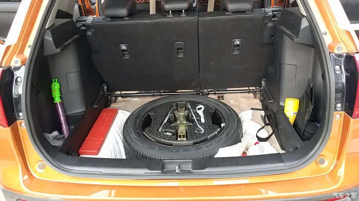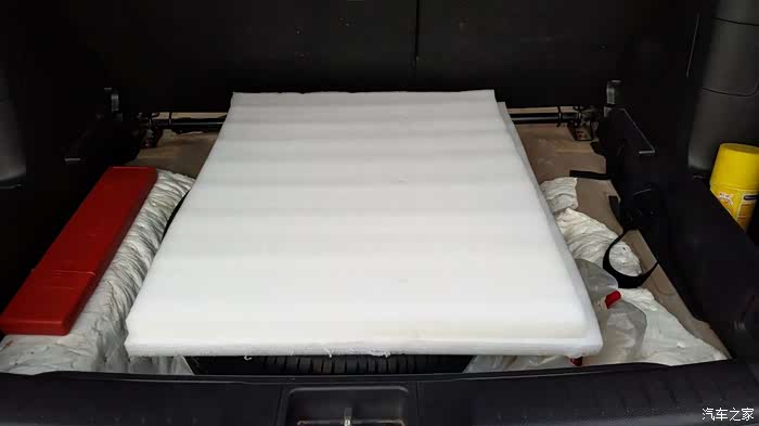 相应“改造”方案:掀开原车行李箱底板,在备胎平面上放上前述60*60厘米发泡塑料地垫2块(共计厚度4.5厘米),再放上前述第一块放样处理好了的木板,最后放上原车行李箱底板。如此施工效果有三,首先几乎全部成人重量由木板直接触及备胎平面来支撑,强度已无问题;二则木板边缘与原三处塑料支撑均有5毫米间隙,当木板承重下压导致发泡塑料变形达且到5毫米以上时才起到辅助支撑作用,其支撑受力已经微乎其微了,平时只起到限位作用;三是此番处置使得行李箱平面与扣下的后排靠背平面完全等高平直,且表面均为原车毡绒材质,便于铺设卧具。仅此一举,承重、定位、平整、稳定、美观的问题均完美解决。