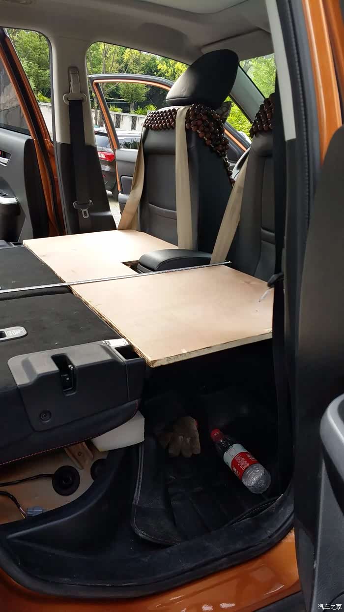 第四步 将前排正副驾驶座椅推到最前方,且将其靠背也收向最前方。准备两根长约1.5米的相对结实的绳索(能承受人的重量,本人是在汽修厂找的报废车辆上的安全带截取合适长度缝制)两头打结,分别挂在正副驾驶椅靠背头枕根部和前述木板边缘。(首次安装只需调整绳结位置使得木板与后部水平后固定绳子长度即可,今后使用方便直接挂上),最后将前排靠背向后轻轻推动卡在第一个调整卡点上。到此该木板被牢固限制在目标位置,既达到水平安放也与其他部件平整靠接,铺上卧具即可享用。此举巧妙地解决了长度、平整、固定、承重、储物空间和方便收纳的问题。
