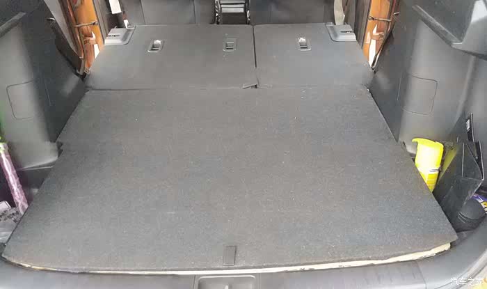 第一步先手动抠掉后排座椅与靠背内侧4个儿童座椅连接卡扣外框塑料件,再捧住座椅两端向上稍微用劲抬起,使得座椅下两个卡扣分离而拆下座椅。将后排靠背三个头枕推入最低处,然后扣动靠背两肩部的释放机构向前搬倒靠背,附身观察其实际呈现的水平程度,若偏高偏低均用前述废旧发泡塑料边角料稍微衬垫调整至水平。