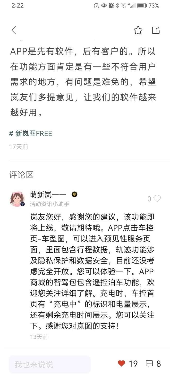 如在车控界面看到车辆的行车轨迹,后来回复说这个涉及到数据安全和保密性,暂时不开放