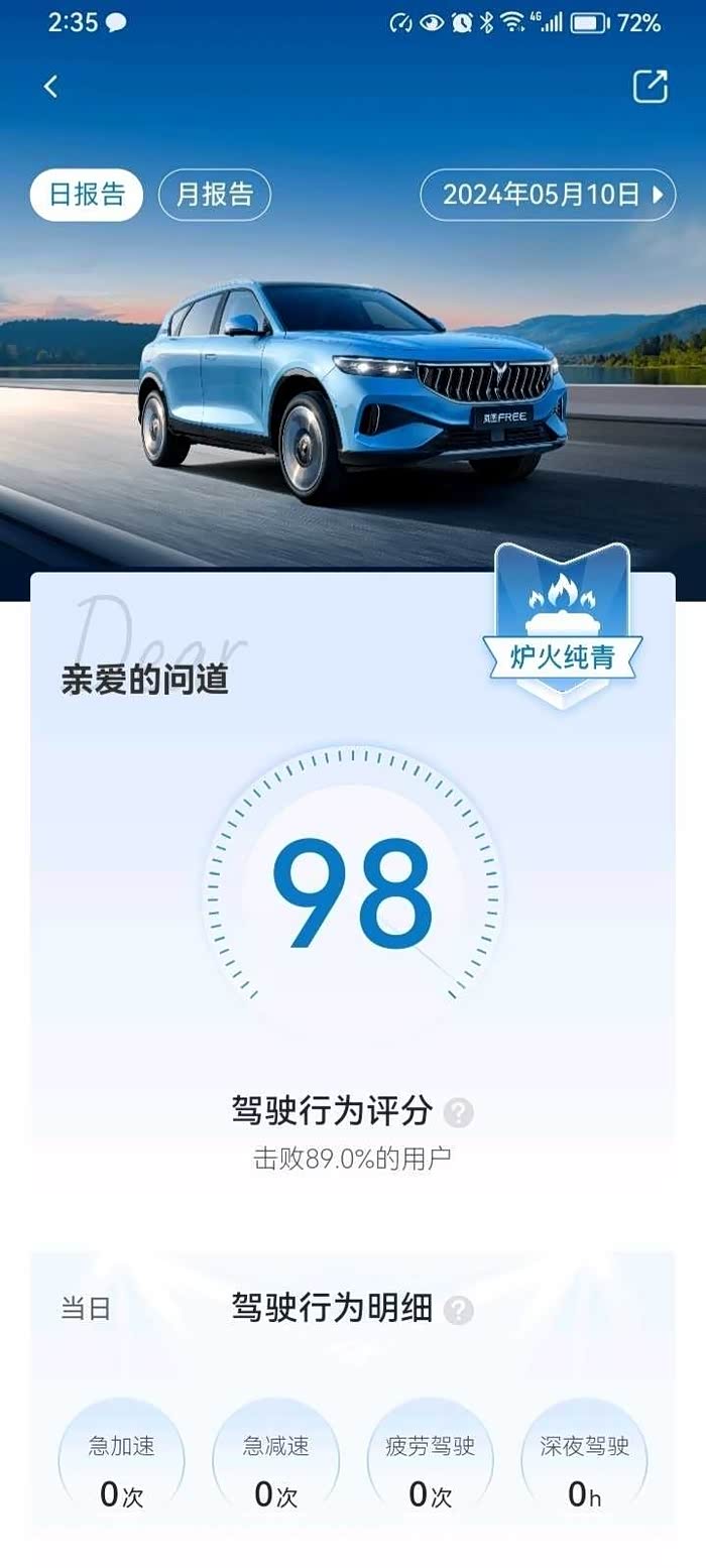 通过app查看车辆信息,点击车辆图片,会显示行车数据“日报告”“月报告”可以查看每天每次的行驶里程、耗电量、驾驶时长、平均速度等数据。(这个功能还是在app里刷帖时看见别人的插图,留言提问后才知道的)