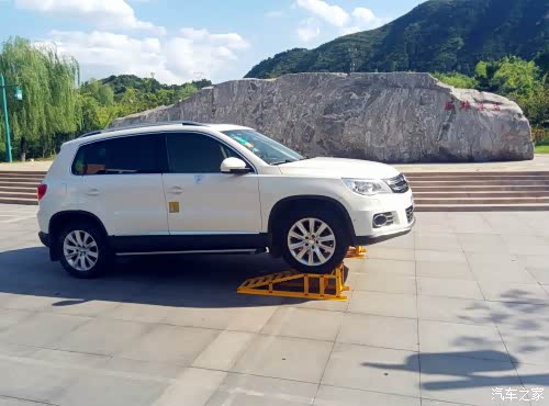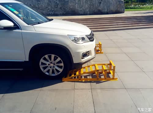 1.先将修车阶梯对准、抵住前轮,修车阶梯保持平行。