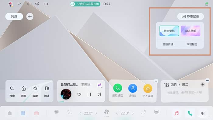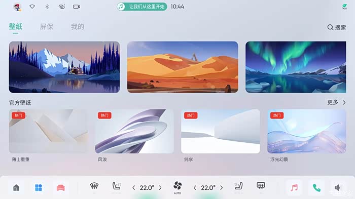 整体布局很像平板电脑:中间大片留白,是“壁纸区域”和“天气挂件”。靠下部的位置,放置了四个可更换的快捷部件,默认是“导航”、“多媒体”、“通话/联系人”、“日历/备忘录”。底部类似于DOCK栏,左边是“桌面”、“所有程序”、“车辆设置”,中间是空调操作面板,右边是常用APP。