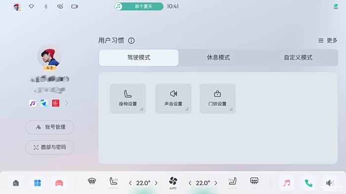 还有很多车主找不到座椅记忆功能了,这个需要点击左上角那个用户头像,里面有三种用户习惯“驾驶模式”、“休息模式”、“自定义模式”,这里就可以设置三套自己喜欢的座椅模式。
