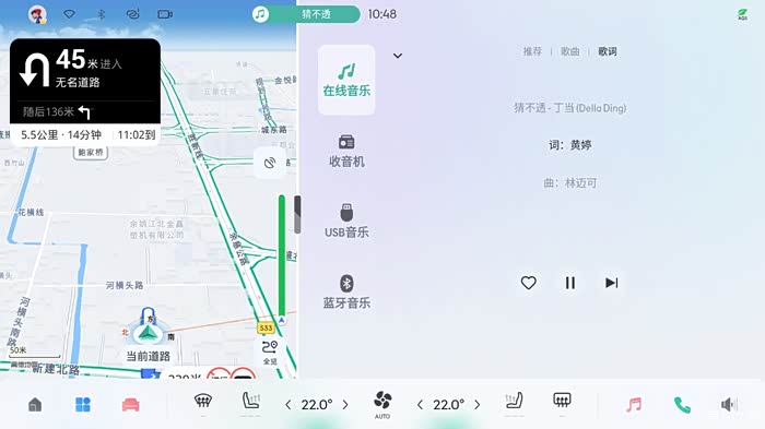 然后,这次新系统还加入了分屏功能。下拉设置栏开启分屏功能的情况下,我们打开导航界面,然后点击上方类似“灵动岛”的音乐播放按钮(下图绿色的那个药丸造型),音乐界面会自动和导航分屏显示。这样就可以满足一部分车主既要看导航,又要看歌词操作音乐的需求了。这里其实官方可以把歌词投射到仪表盘右侧,可能为了安全吧。