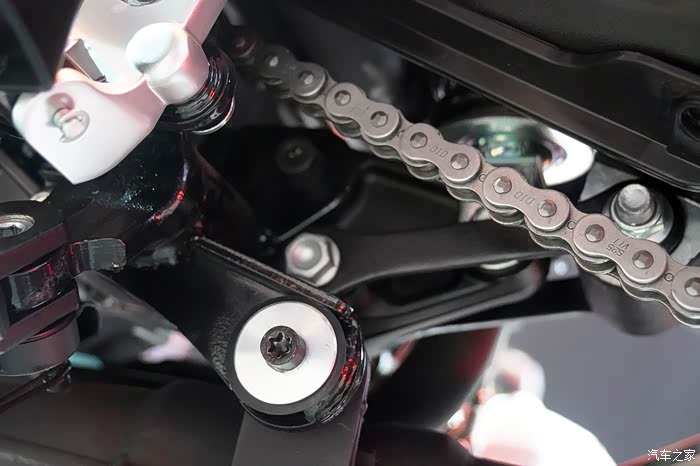 皮质座垫质感出色线条流畅,前减震采用一副目测37mm叉芯的不可调倒置减震,而后减震则是复古车型运用较多的双侧布局且能够使用绞牙方式进行预载调整。虽说发动机功率不会太大,但闪250依然采用皮带式传动结构。