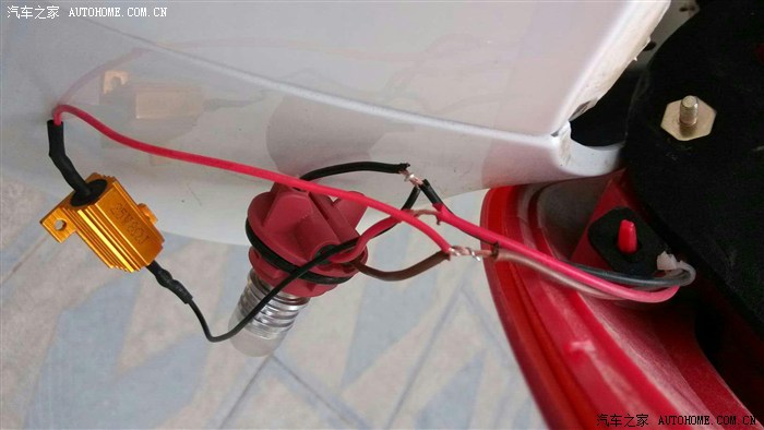 刹车灯改装没有成功,因为电阻的原因,行车时只有一个亮,刹车时都亮,各种实验证明LED灯泡没问题,也在低亮度控制线上加装了25W8Ω的电阻或并联小灯。已网购50W16Ω电阻2个在路上,回头再试试。