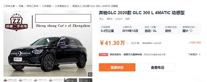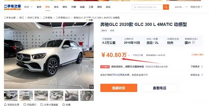 2020年3月6日,突然我在汽车二手车之家上面看到一辆2020款GLC300L动感型,白色的,标价40.8万,如下图: