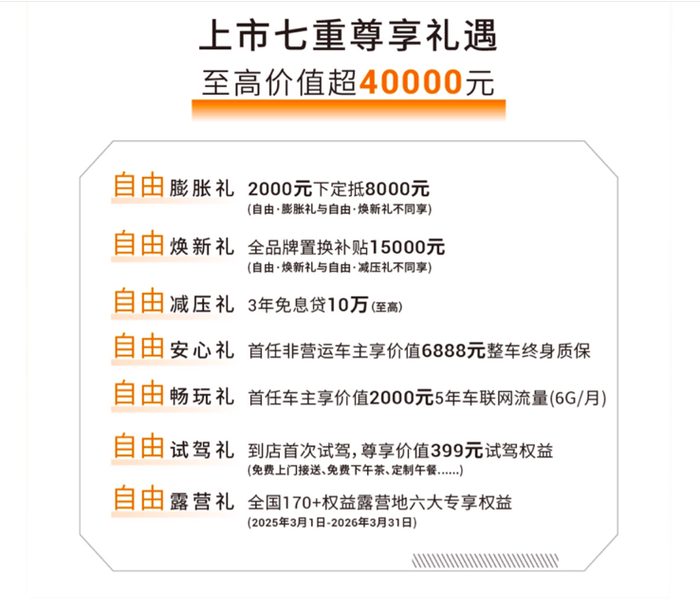 不知道具体什么七重超值权益,估计是算上终身质保,露营权益这些吧,然后就是订车送爬架小书包,多少抵多少