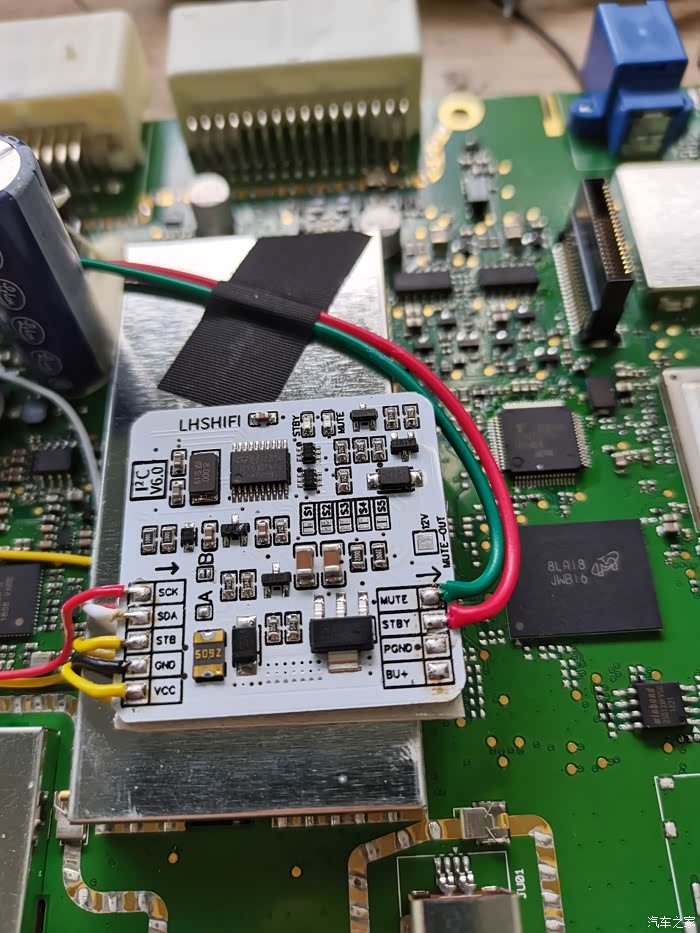 原车功放芯片是TDA75610slp,不能直接替换TDA7850,其实解决的方法有很多,可以用一个555定时模块接待机,延迟10秒后打开静音即可解决冲击声。也可以直接买一个解码小板。直接焊接即可,方便快捷,but价钱小贵。