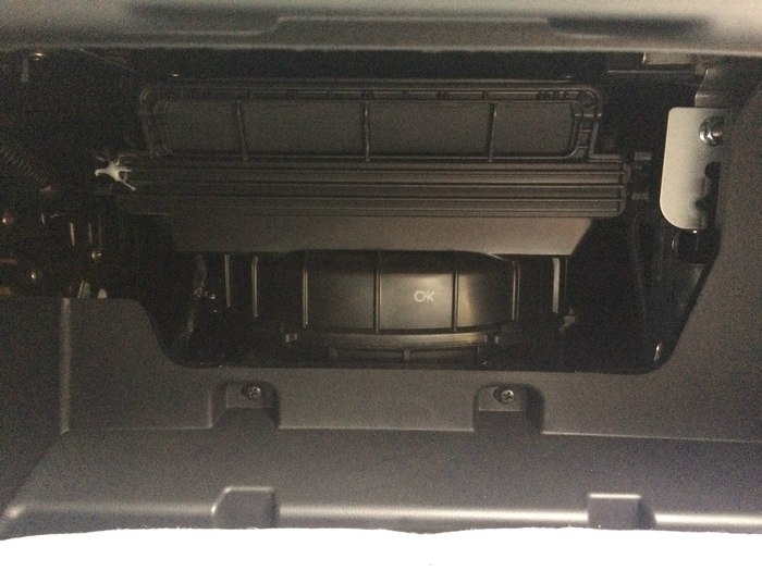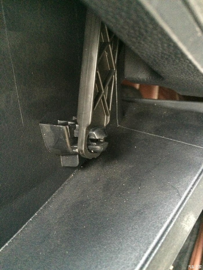 2、手套箱右边有个卡扣,取下后手套箱可以翻到最下面,里面的空调滤芯就漏出来了