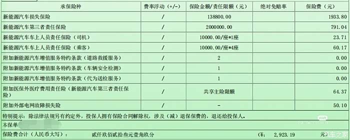 保险费用:这个可能会因地区和车型版本价格有所不同。但是据我了解电车一般一年的保险费用大概在 4000 元到 8000 元之间,我的保险费用是3873元,出保单的时候应该是4200多元,有些不需要的保险退了的,所以要稍微便宜点。