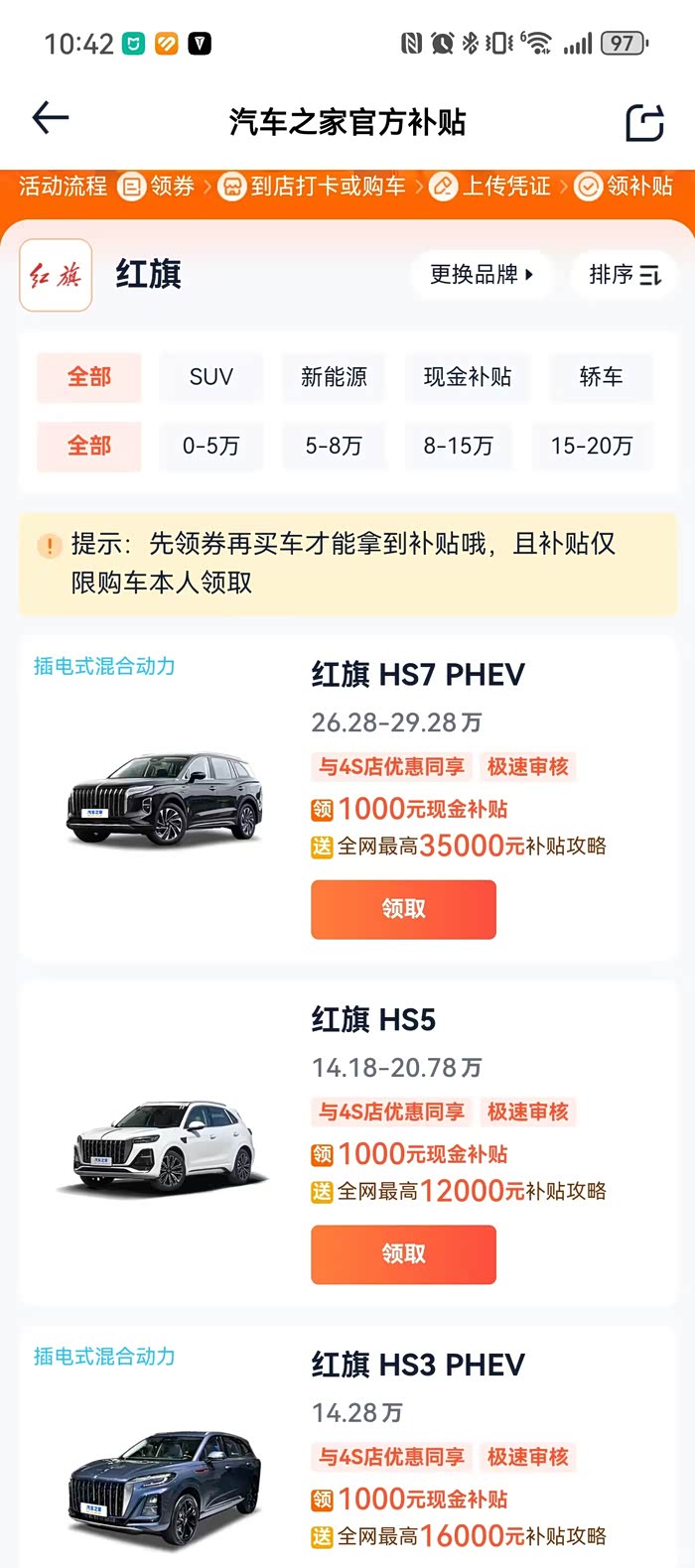 红旗车系 ,用户都享有1000元现金补贴,最高35000元补贴,且与4S店优惠同享;