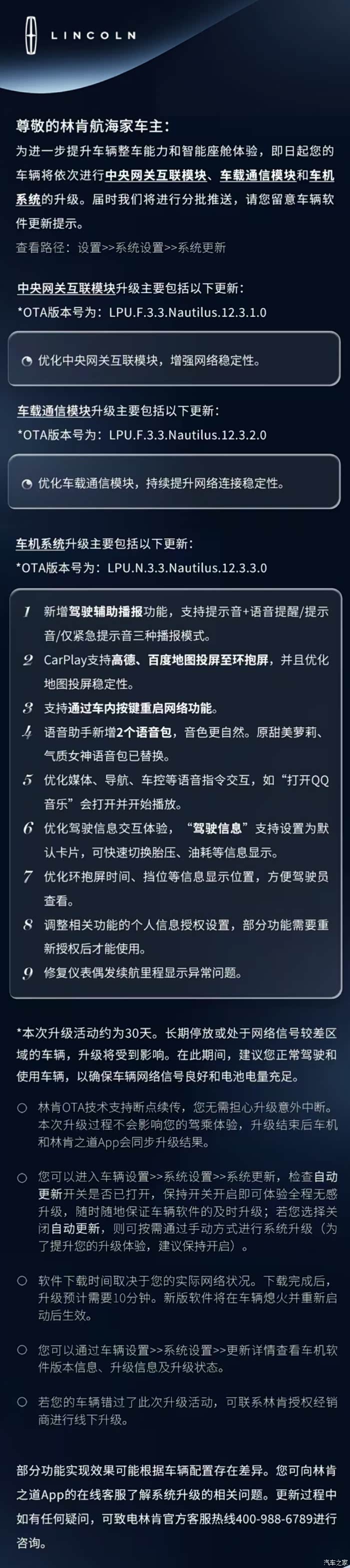 2025年6月30日,我这款2024年9月底生产的林肯航海家收到了第三次OTA升级提示。也就是在2025年上半年完成3批OTA升级。个人觉得这个频率还是可以的,如果能把大家一些盼望已久的功能给完善了,那就更好了。