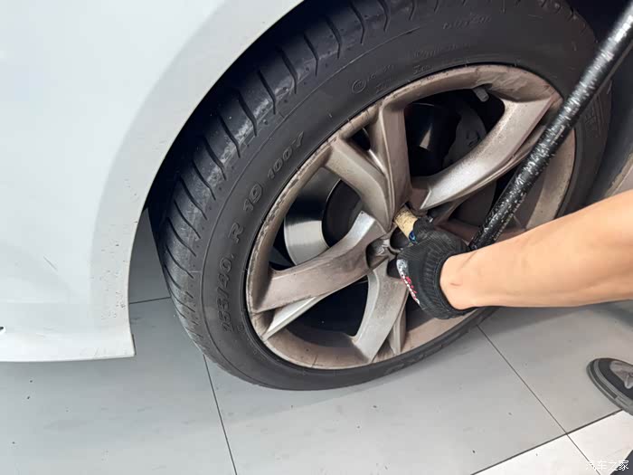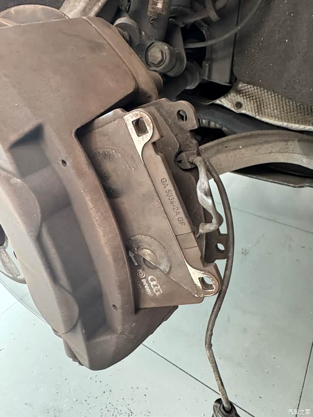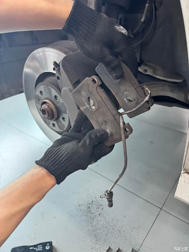 师傅拆下原装的刹车片,可以看到左前轮是有感应报警线连接的。