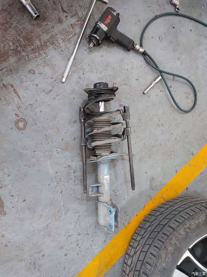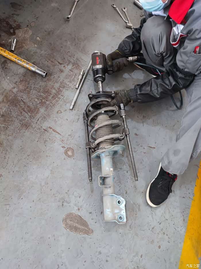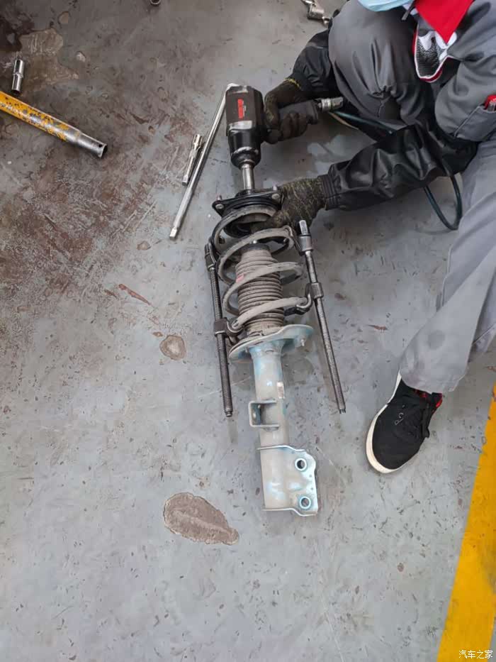 接下来,就是上弹簧压缩机,这些说一句,拆卸塔顶的时候,要使用扳手,不能使用风炮,但是没有一个维修师傅会这么做,都是图轻松,这个非常不好。拆装减震器,我们可以顺便检查部件的老化、损坏情况,比如缓冲块、防尘套、平面轴承等。为各部件做彻底的检查,并及时更换新部件,不仅让减震器“满血复活”,还能更好发挥新减震器的性能,非常关键!