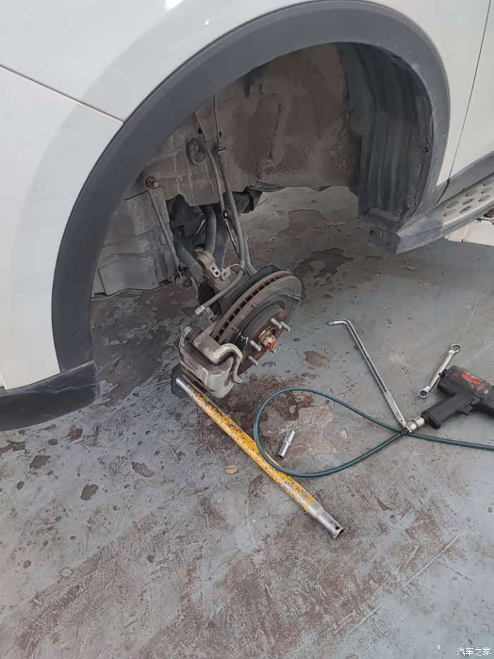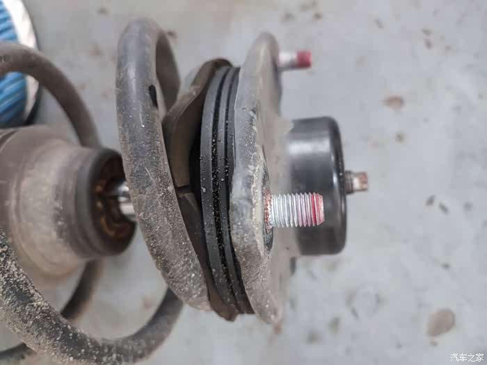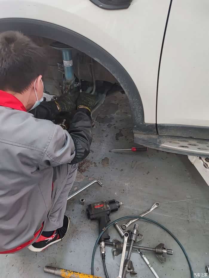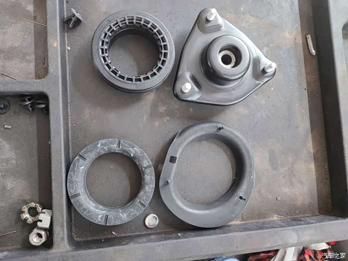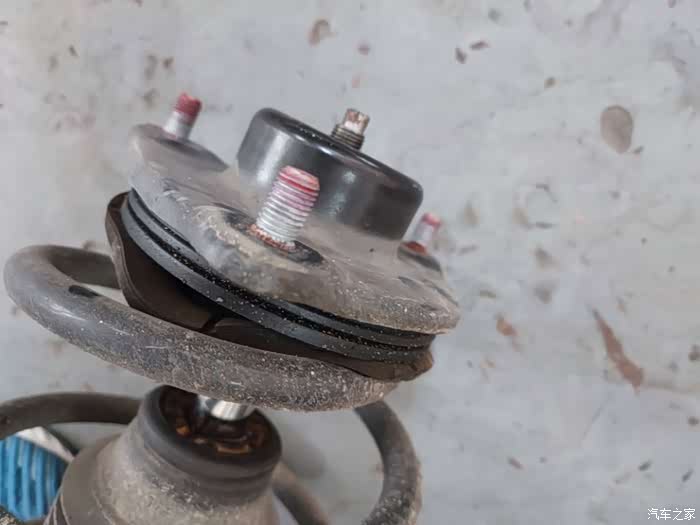来到4S店开单检查,初步判断也许是平衡杆胶套老化导致。上架拆掉一遍平衡杆连接杆的螺丝,异响依旧,最终判断是前左避震弹簧上衬垫以及顶胶老化导致,于是打算更换这些配件。
