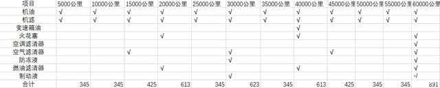 首先来看保养费用,宋PLUS DM-i的首保在5000km,不需要支付费用,项目为更换机油和机滤。随后是每5000km保养一次,相较于同价位的其它品牌7500km或者10000公里保养周期,宋PLUS DM-i的保养次数要更加频繁一些。不过好在价格并不是太贵,像机油和机滤这样的基础保养包含工时为345元。而随着行驶里程增加,空调滤清、燃油滤清、火花塞、制动液、防冻液等项目也会加入进来。整体价格范围会在345至613元之间来回浮动,在60000公里的时候会有一次大保,费用为891元。