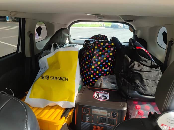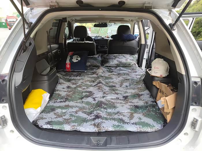 3、最大好处,空间大,车后备箱放倒后够平够长,睡俩人正好。路上多次露营,把行李堆在前座,睡得很舒服。