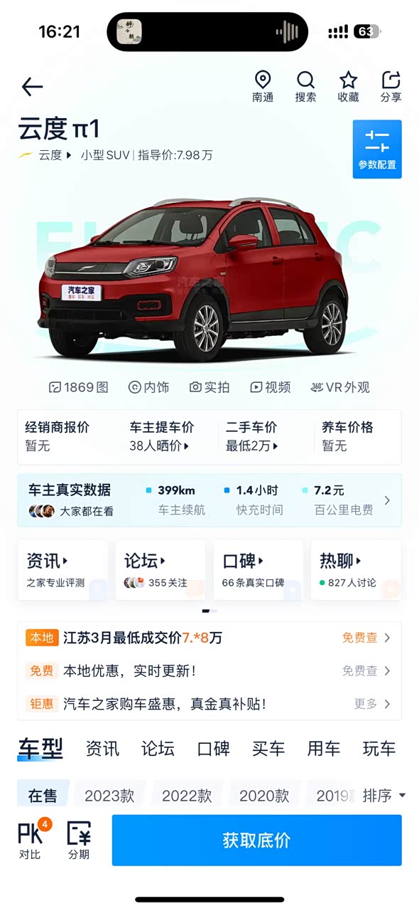 因为有朋友开大运,说得大运车不错,才去看看大运,店里摆着一台云度,看着主要空间大,就问了一下,只不过没有人听说过云度汽车,我也没听过,纠结这个品牌怎么样,长不长远,问身边朋友,认识的没有,最终买它,还是因为这个车性价比很高,空间大,轮胎大,电机大,不到 8 万块钱,比大运贵万把块钱。