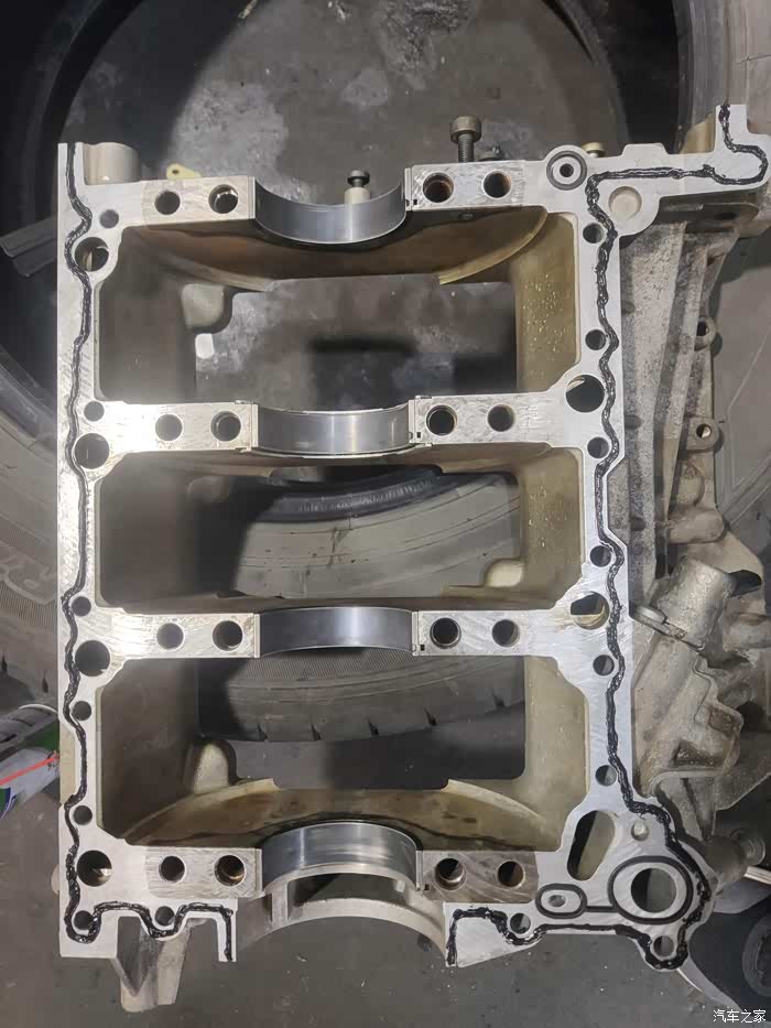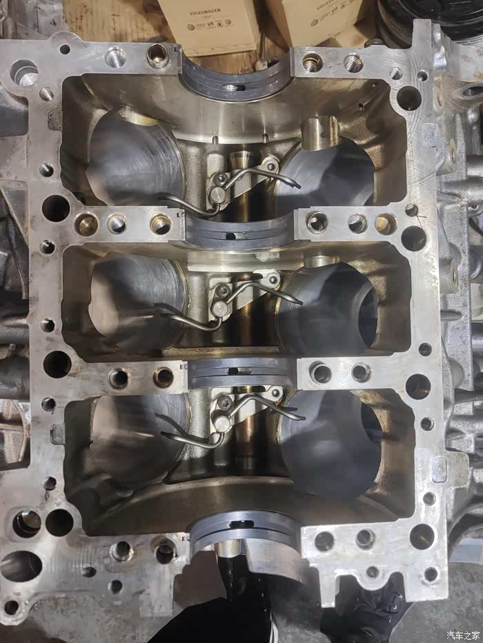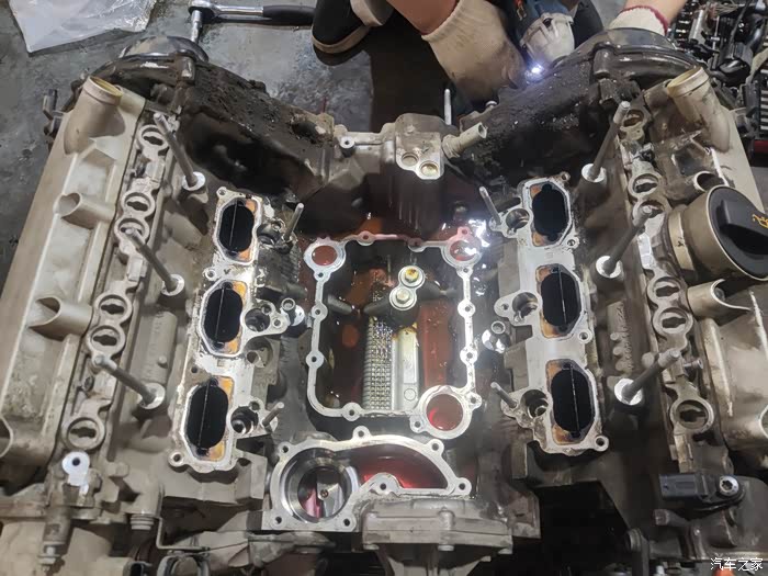 不过今天的主角儿是第三代EA837,是一台12年的保时捷卡宴。总行驶里程8.5万公里。故障现象,左侧气缸正时部分异响,机油消耗严重。没分解之前检查负压正常(废气阀状态良好),内窥镜观察燃烧室积碳严重,缸壁轻微拉伤。从经验上来看直接抬机器,落地大修!接下来是正文(由于人手不足自己动手,所以照片有些含糊,诸多细节都忘记照。。。。望各位客官老爷多多包容^-^)