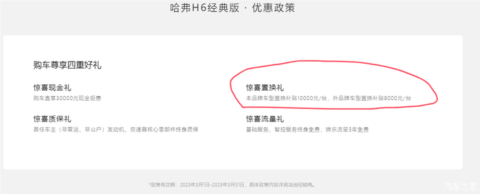 - 厂商补贴:一般来说,本品牌车型置换哈弗H6经典版,厂商会补贴10,000元/台;外品牌车型置换,补贴8,000元/台。