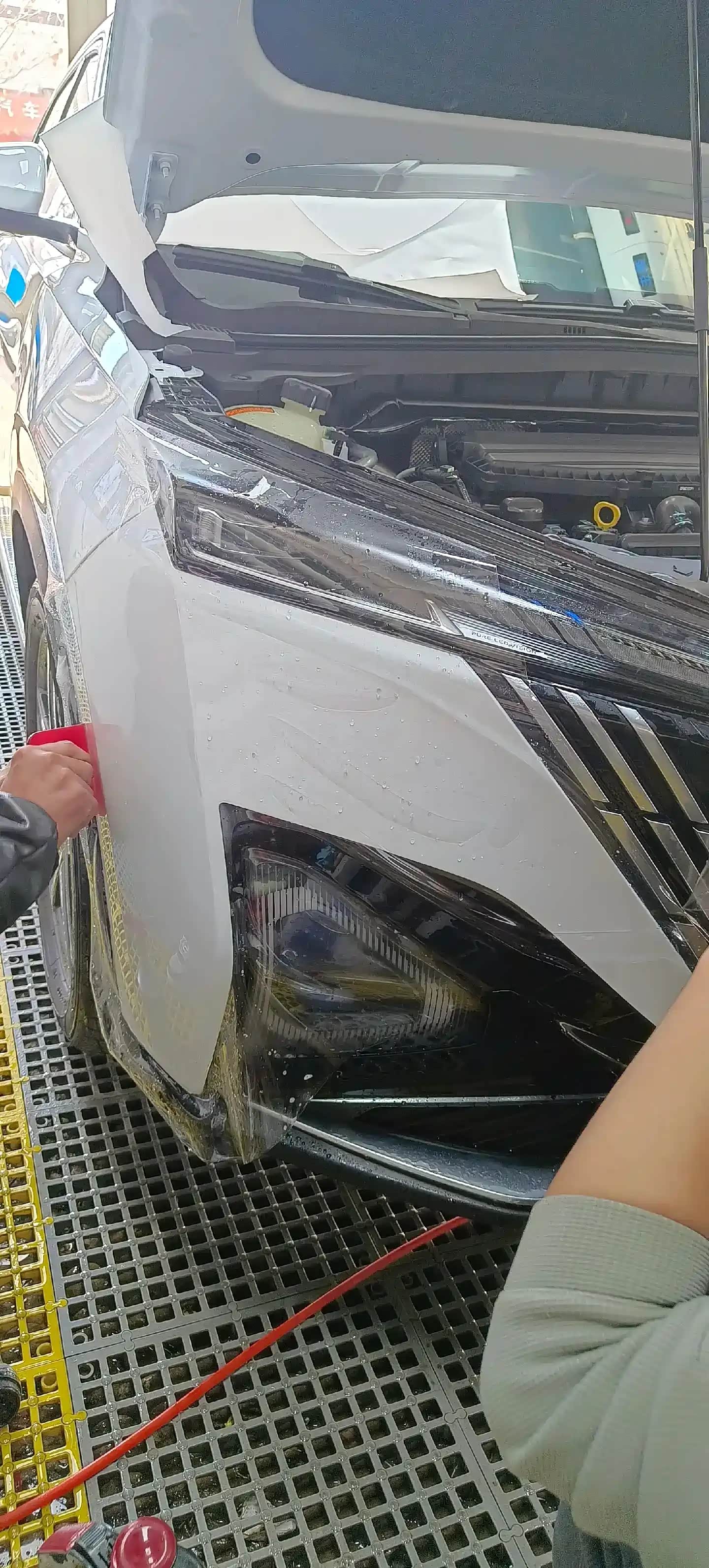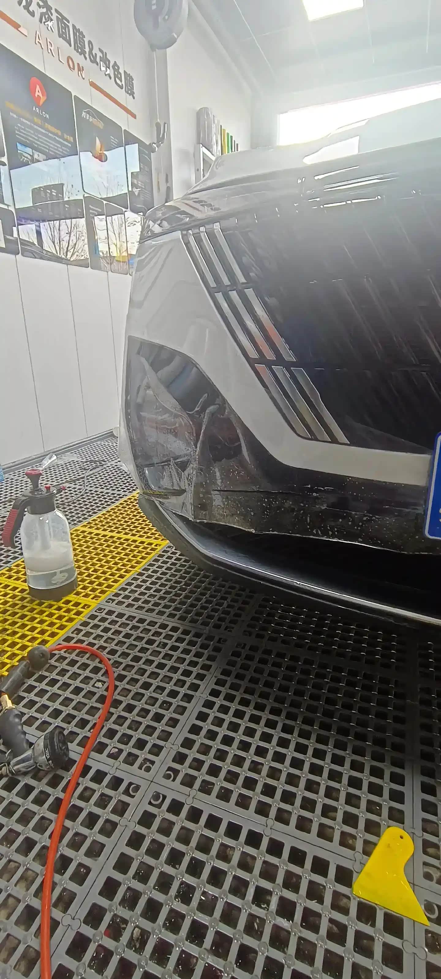师傅先在车身表面均匀喷洒了一层透明的安装液,据说这种液体能降低车衣与漆面的附着力,方便贴装时调整车衣位置,还能减少气泡产生,让车衣贴合得更紧密。