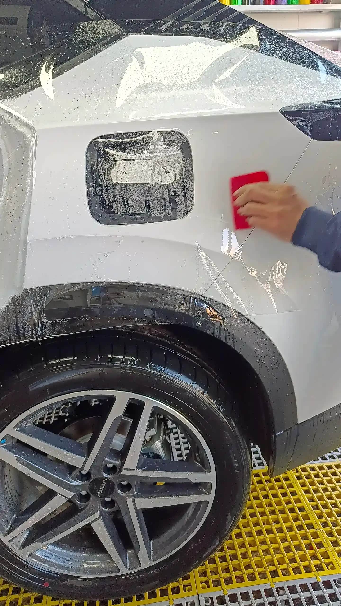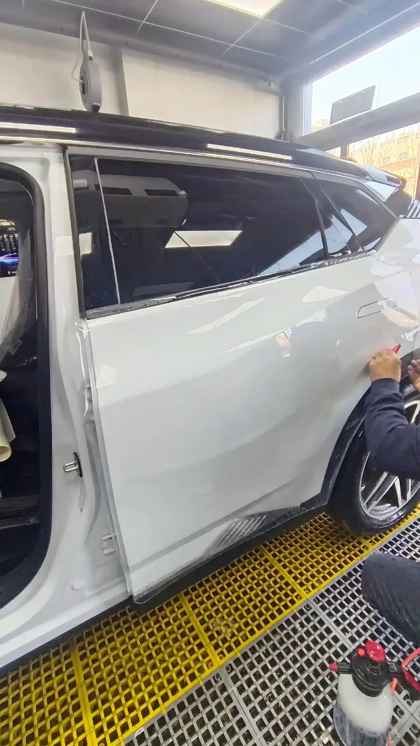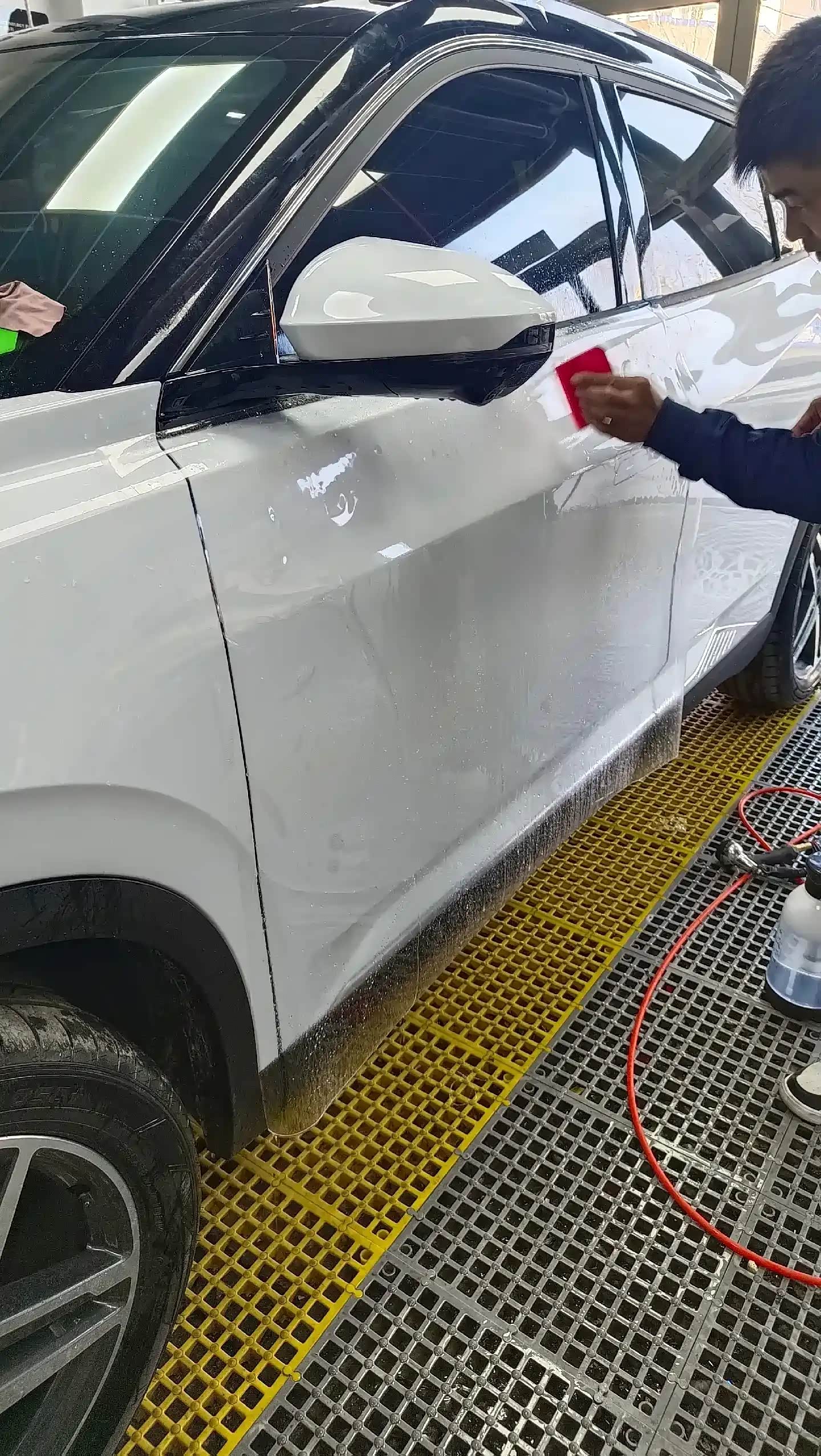 施工第一步是全车深度清洁,这也是保障车衣贴合度的关键。师傅先操控高压水枪,对着车身反复冲洗,强劲的水流把车身表面的浮尘、泥沙都冲得干干净净,随后又均匀喷洒洗车泡沫,拿着柔软的抹布顺着车身线条慢慢擦拭,连轮毂缝隙、车门边框、车窗密封条这些容易藏灰积污的角落都没放过,来来回回擦了好几遍,确保表层污渍彻底清除。之后再用高压水枪冲净泡沫,车身表层的杂质基本都清理完毕了。