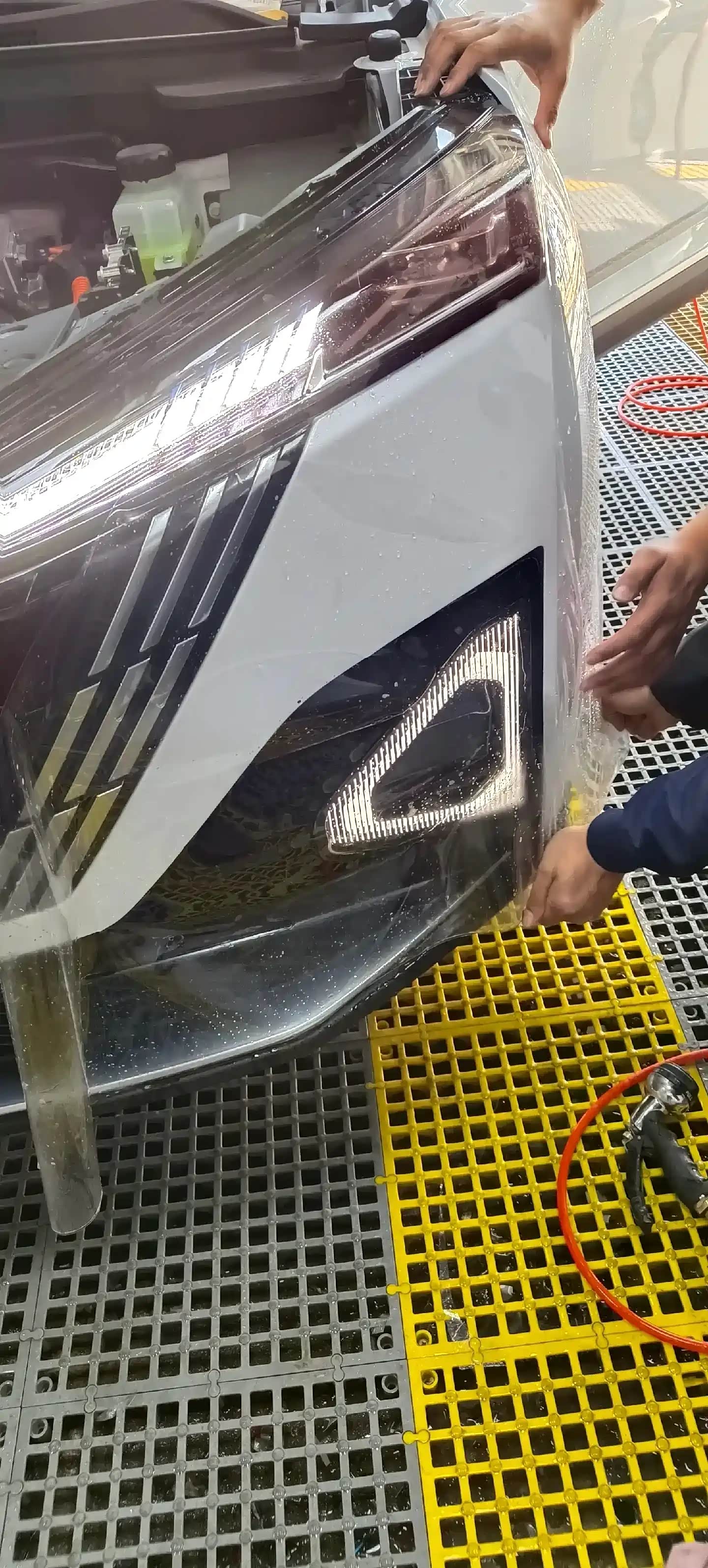 随后,师傅和助手默契配合,小心翼翼地把裁剪好的隐形车衣展开,从引擎盖开始,一点点对齐车身轮廓平铺,每铺展一段都会仔细调整位置,确保车衣与车身线条精准契合,没有丝毫偏移,避免后续出现贴合不规整的情况。