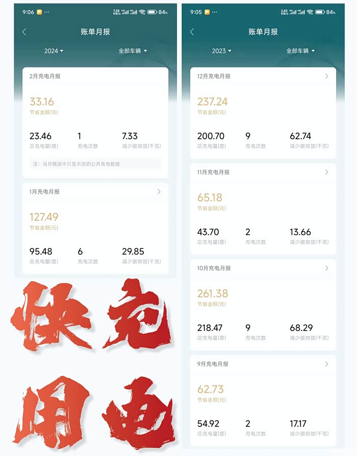 自2023年9月至2023年12月止,快充共计充电:554.33度电,共计减免花费626.63元。2024年1月,共充电95.48度,共计减免花费:127.49元。 快充充总共充电:649.81电。 共计减免花费754.12元。